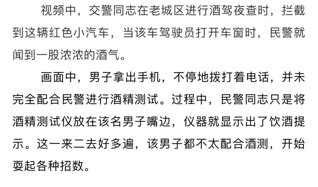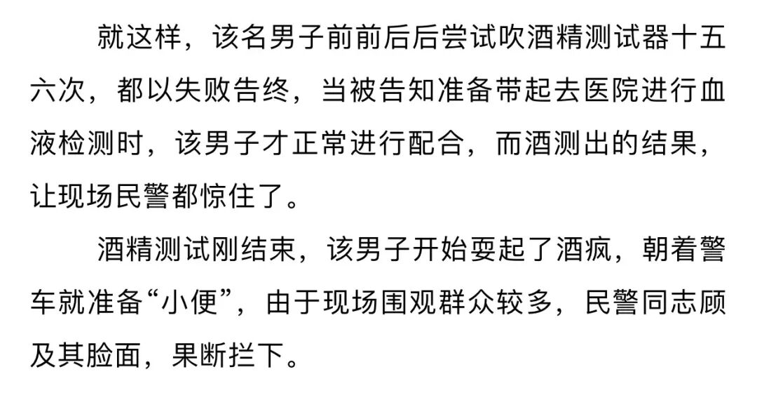 询问期间,男子一会儿说自己是在滨江大道吃的饭、一会儿又说自己在宏德大道附近吃的饭,说话含糊不清,神情欢呼,这要是继续驾驶车辆,可真的后果不堪设想。我们接着来看,这喝多了酒的场面有多尴尬。
