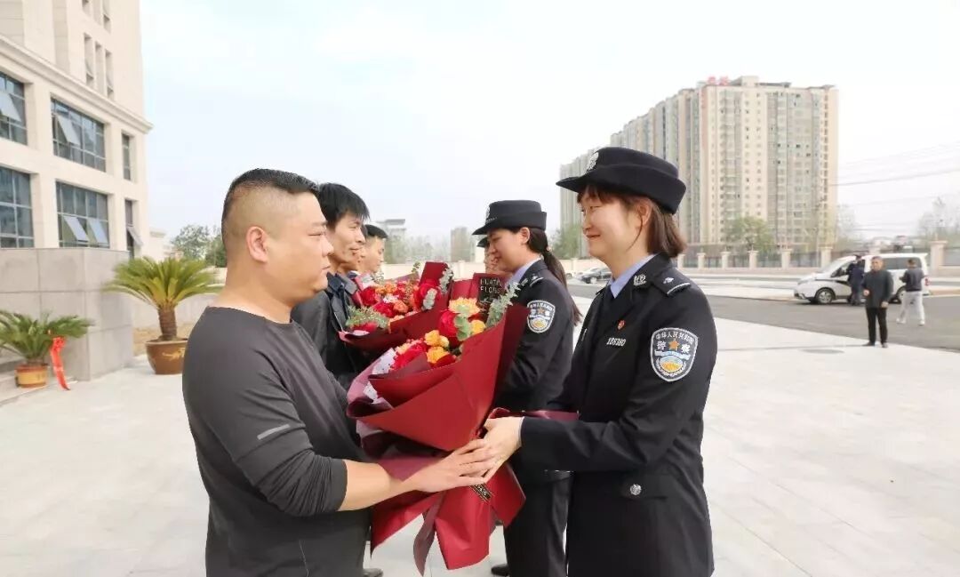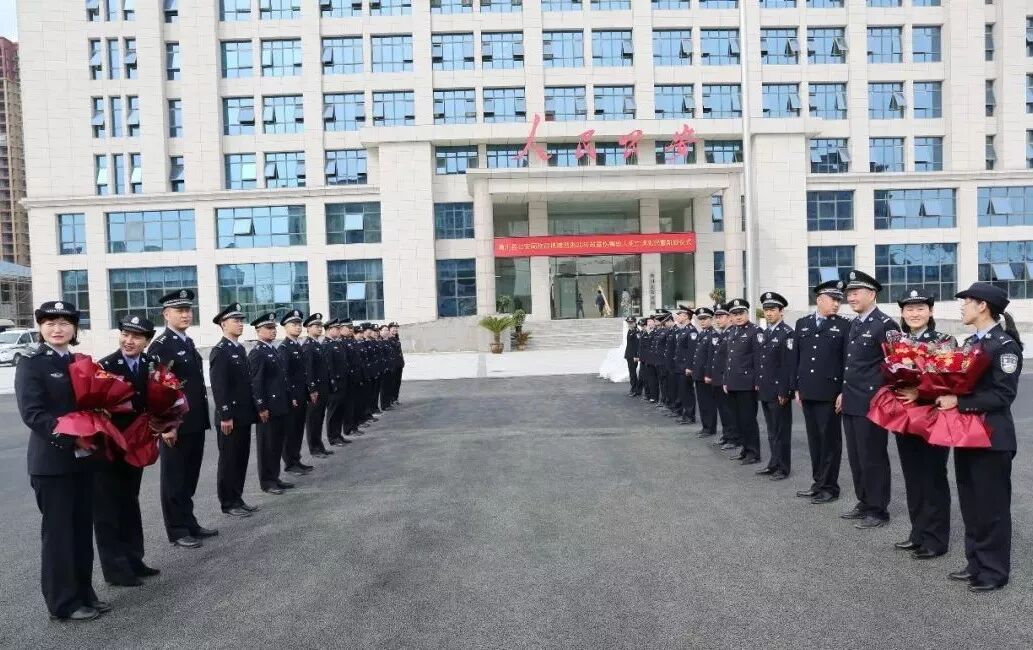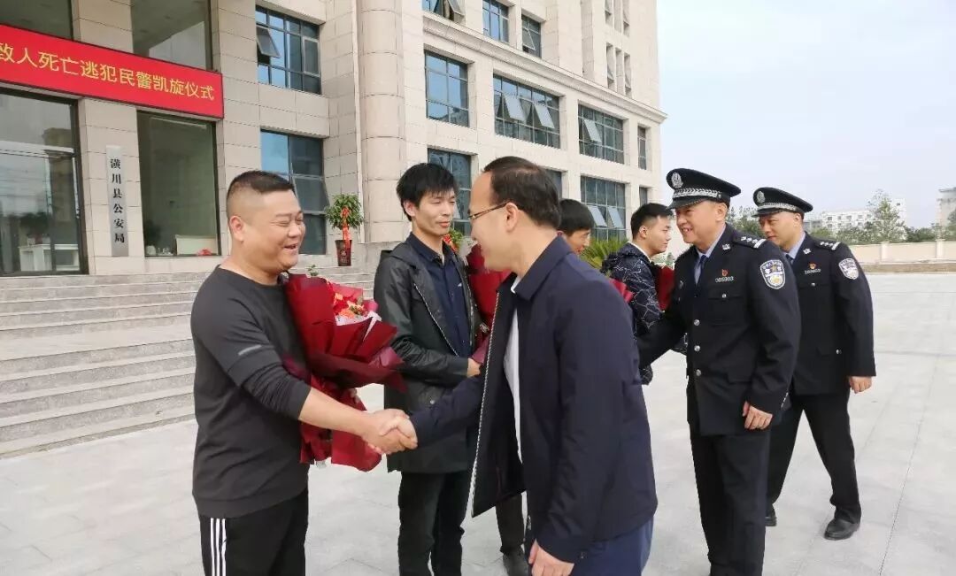 信阳市潢川县委常委、政法委书记陈旭东,县公安局政委王冬冬,副局长董俊杰,局党委委员杨洪德率领民警在潢川县公安局门前举行欢迎仪式,迎接追捕组民警凯旋归来。