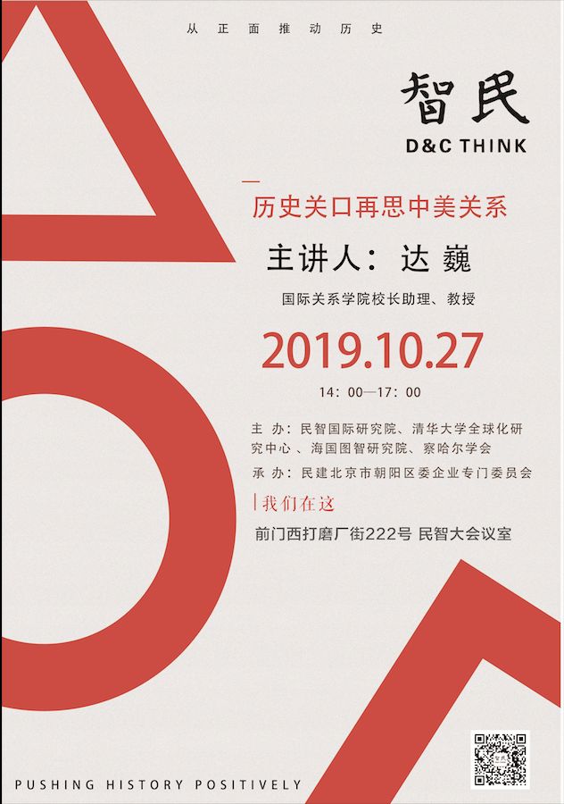 因此,为探讨这一问题,民智国际研究院、清华大学全球化研究中心、海国图智研究院共同邀请国际关系学院校长助理达巍教授发表主旨演讲《历史关口再思中美关系》,并与相关专家、学者一同探讨上述问题。