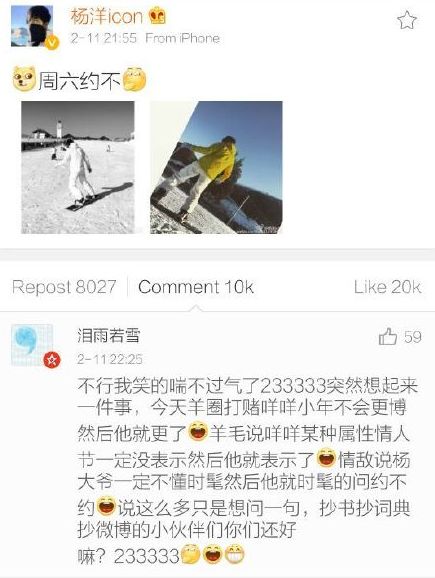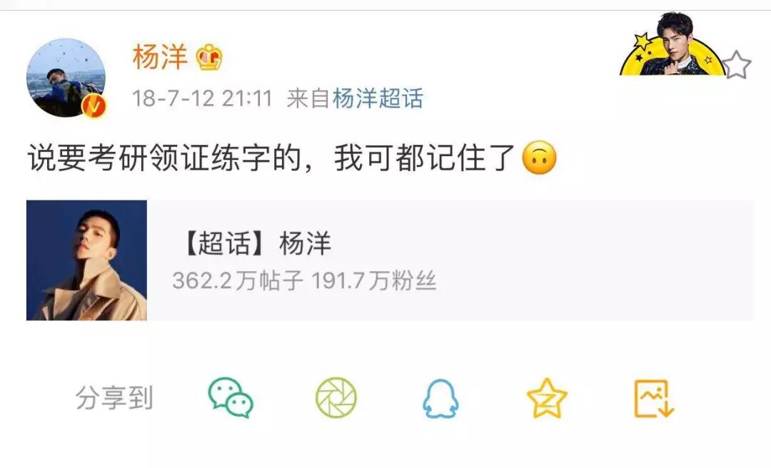 大概是羊毛们打赌的事件闹得很大,被窥屏羊发现了,于是咱们的杨洋哥哥“贴心”地满足了各位朋友的需求,在21:55这个难忘的时间,他真的更!博!了!