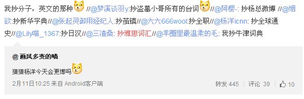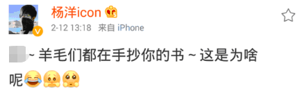羊毛们兑现承诺,纷纷手抄起赌注里的书来,某羊竟然还得意洋洋的和当时一本书的作者说:“羊毛都在手抄你的书,这是为啥呢?”微博后还放了“笑哭”“委屈”“可怜”三个表情,这三个表情真是活灵活现的传达了某坑羊毛协会会长早年形象,从此这只羊的坑毛形象就稳稳地竖立在广大抄书羊毛的心中,直到现在仍然不倒。
