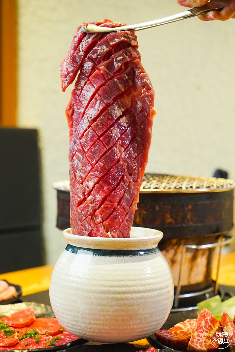 店里最近新出了整块烧系利,都是XXXL版本,自带吸睛属性。熟成好的牛肉大块上桌,滚着烤至焦面后再现场切开,整套吃肉流程很有仪式感。