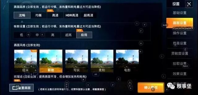 1、画面设置(手机配置不高没有极限和选项的也可以把帧数设置选择“高”或“超高”),记住这个版本的画面风格一点要选“鲜艳”: