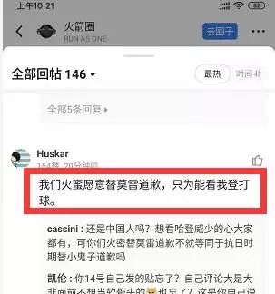 但是中国部分火蜜依旧不死心,千方百计找火箭的比赛观看,甚至有体育大V在网站发布火箭比赛的视频回放,还有人留言称,“为了看火箭比赛,我们替莫雷道歉!”典型的跪族男孩言行。从目前NBA回应看,很可能央视不会在新赛季直播NBA,除非NBA和中国官方关系有实质性的突破。为争一口气,请和关于火箭的任何消息说“再见”!