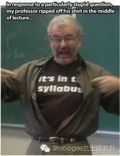 所以,如果通过阅读Syllabus或者自行google就可以得到答案的问题尽量不要去麻烦教授,这会使你在教授心目中的形象成为一个偷懒的伸手党。当然,如果你真的问教授一个特别愚蠢的问题的时候,说不定教授会真的发飙(虽然美帝的教授脾气真的都还蛮好的),比如撕开了衬衣……