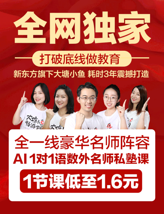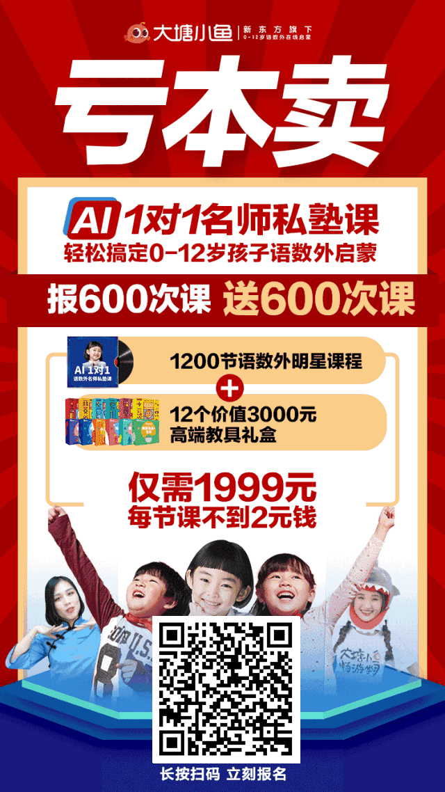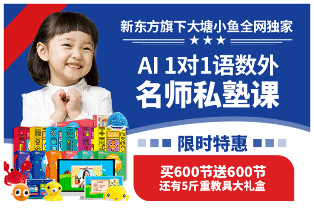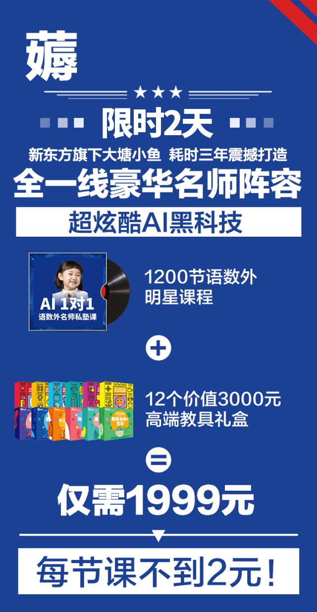 新东方旗下大塘小鱼AI 1对1语数外名师私塾课 倒计时最后2天 语文、数学AI课关闭报名通道 限时2天内报名1200节 语数外AI课仅需1999元加赠3000元 超值配套教具大礼盒点击“阅读原文”立即抓住最后报名机会