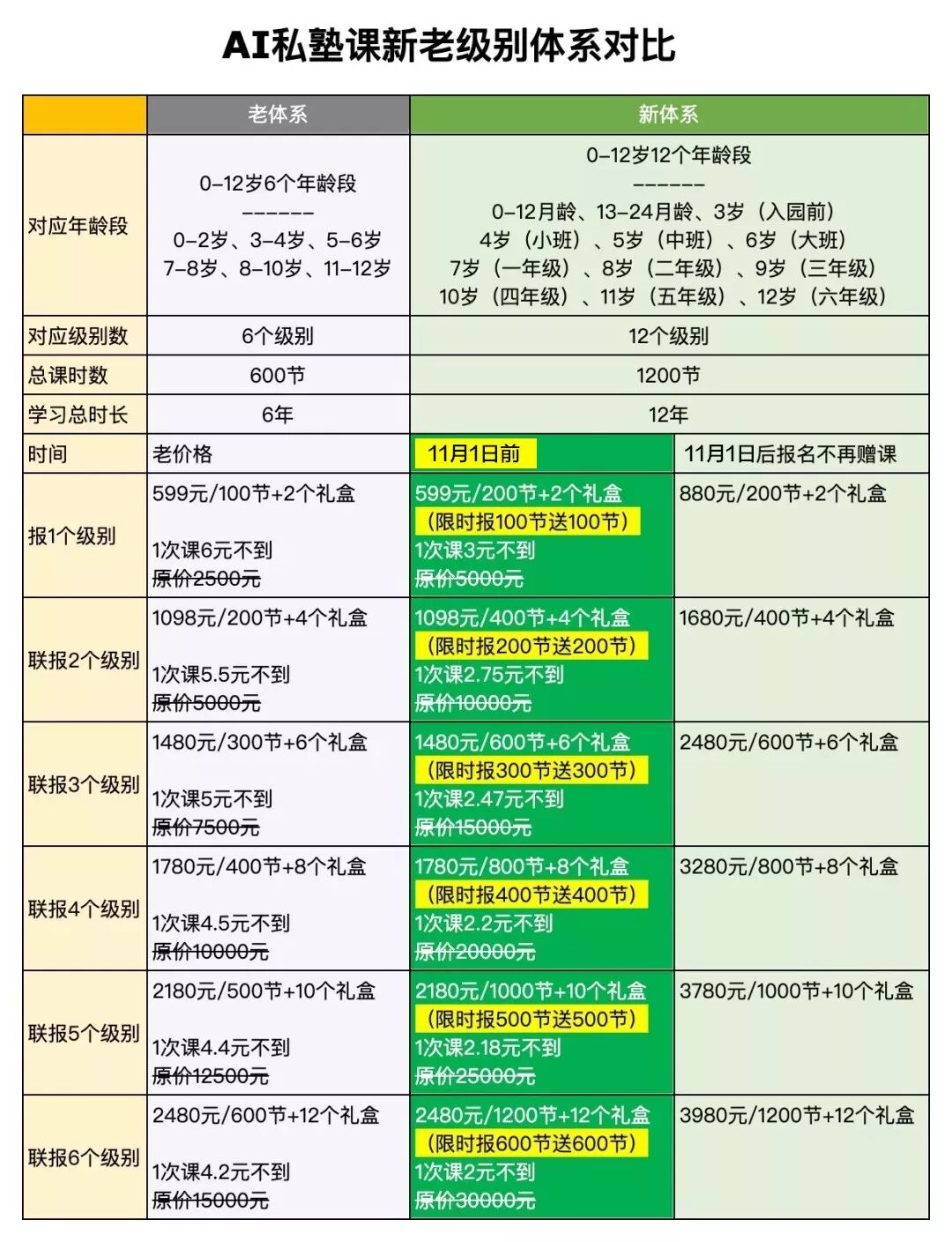 也就是说,报名全部6个级别共1200节的AI 1对1名师私塾课,仅需1999元,每课时不到2元!还赠送全部课程配套的12个教具礼盒,共120个实体教具礼物!