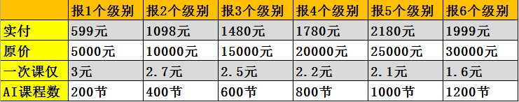 抓紧最后机会,每多报一个等级,对应的折扣就更低,报满全部6个等级的课程,课单价可以低到1.6元!