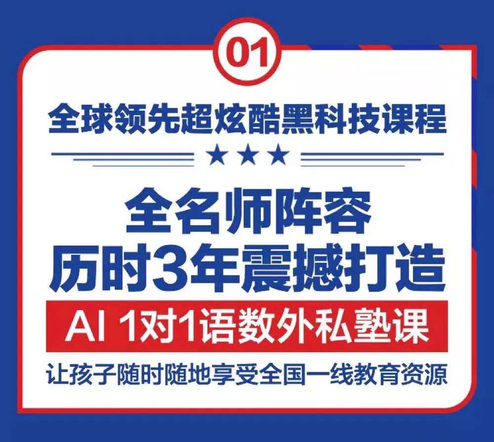 在耗时3年准备、倾尽全力邀请全一线豪华名师阵容加盟之后,我们砸重金正式推出一套既和全球最新AI科技教学同步的教育手段,又符合中国孩子语数外学习辅导习惯的课程——“AI 1对1语数外名师私塾课”
