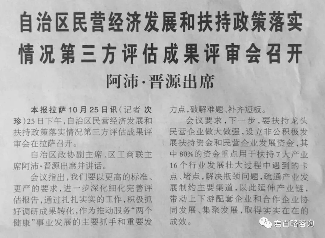 2019年10月25日下午,西藏自治区民营经济发展和扶持政策落实情况第三方评估成果评审会在拉萨召开,自治区政协副主席、区工商联主席阿沛?·晋源出席并主持评审会,自治区工商联党组书记纪世德、工商联多位副主席、自治区发改委、经信厅、财政厅、国资委等自治区非公经济工作领导小组成员单位的领导和相关处室、自治区民营企业家代表出席了评审会。评审会上,君百略咨询团队向会议简明扼要地汇报了《西藏自治区民营经济发展和扶持政策落实情况第三方评估》以及《西藏自治区民营经济发展战略和扶持促发展重点举措》的研究咨询成果。