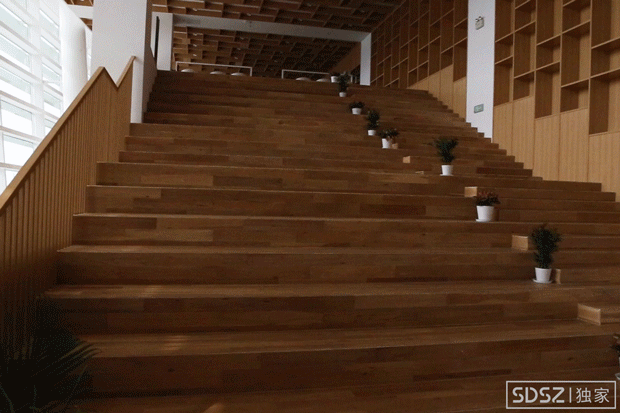 从大厅延伸出的木质楼梯可以由此直接通往二楼,一楼二楼呈现半连通式挑高设计,木质楼梯一侧后续会铺设坐垫,作为公共阅读区。
