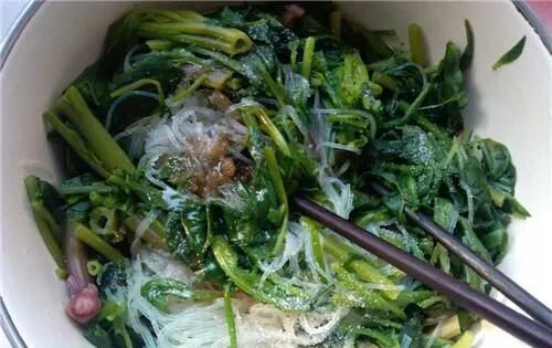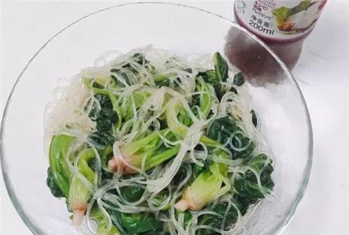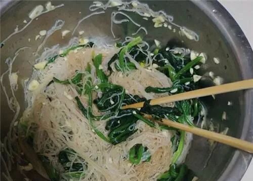 第三步:最后将刚才的菠菜也拿过来,并且将它放入开水中,将它焯水熟之后就可以捞出了,另外在菠菜焯水的时候可以滴上几滴油。接着我们将焯水好的菠菜和煮好的粉丝都放入碗中,并且加上盐油以及醋之后,用筷子将它们搅拌均匀后就可以出锅了。