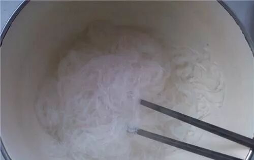 第二步:接着取出一小把的粉丝,然后取出锅的同时在锅中倒入少许的水,并且开大火将它烧开。接着就可以将刚才的粉丝放入锅中,等到粉丝在锅中煮熟煮软之后就可以捞出并且放入盆中备用了。