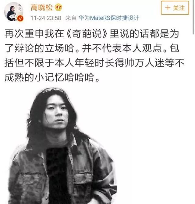 面对因为自己为了节目效果说的一句话引起的话题,高晓松也是迅速在微博做出解释和回应,称:自己说的话都是为了辩论的立场,并不代表个人观点,并包括但不限于年轻时长得帅万人迷等不成熟的小记忆。