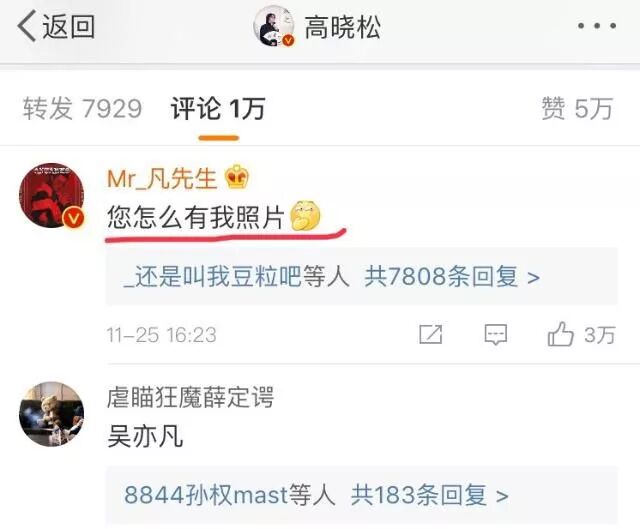 吴亦凡直接跑到高晓松微博下面评论:您怎么有我照片。