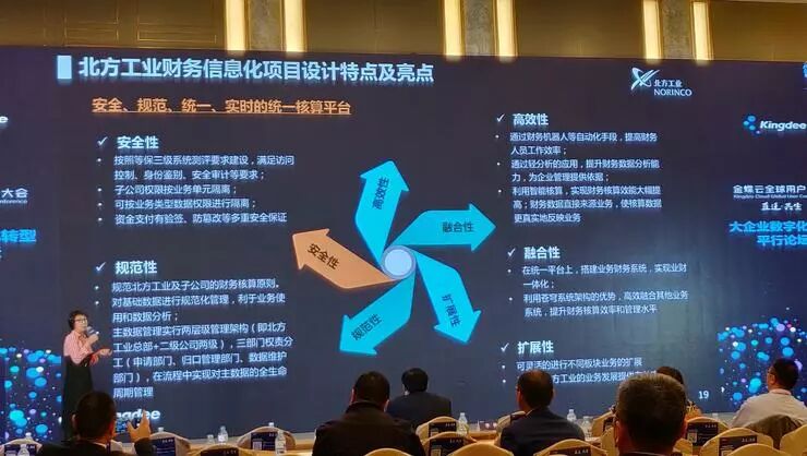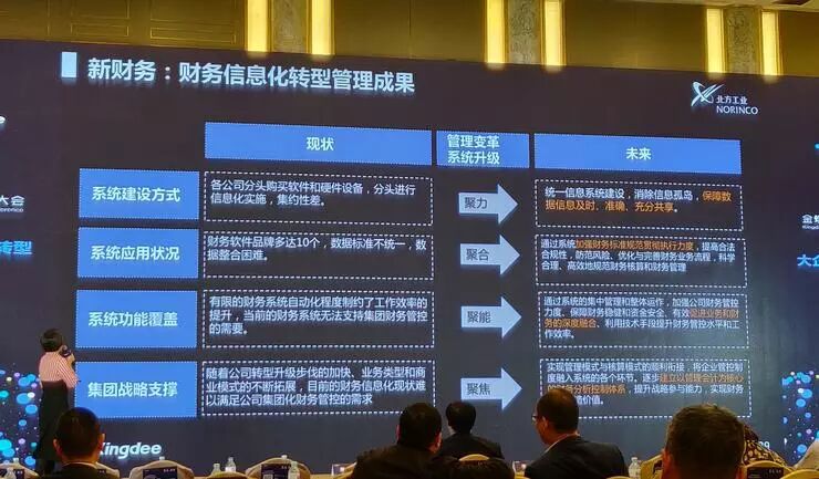 我今天给大家分享的是《中国北方工业有限公司财务信息化转型探索》。主要分为四部分:一是财务信息化转型背景;二是项目实施过程中的新方案设计;三是项目应用中达到的效果与亮点;四是预期取得的转型成果。