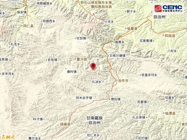 在甘肃甘南州夏河县(北纬35.10度,东经102.69度)发生5.7级地震,震源深度10千米震中距夏河县19公里距合作市23公里、距临夏县52公里碌曲县60公里、距和政县70公里距兰州市148公里地震发生时,甘南州合作市夏河县震感强烈天水市、兰州市有明显震感