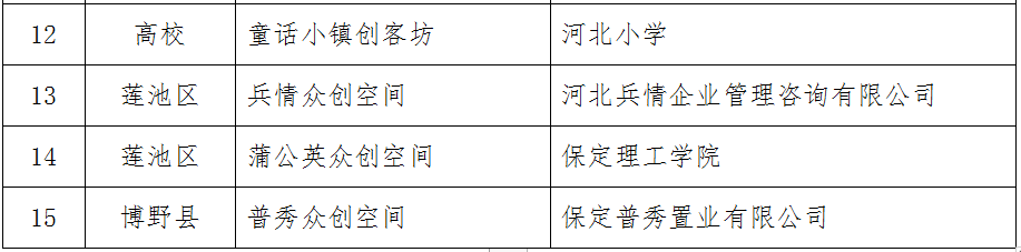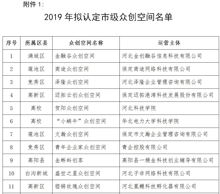 按照《保定市科学技术局关于开展2019年市级科技企业孵化器及市级众创空间认定工作的通知》(保科字﹝2019﹞53号)文件要求,依据《保定市众创空间认定管理办法》(保政发﹝2018﹞18号)、《保定市科技企业孵化器认定管理办法》(保市政科字﹝2018﹞21号)相关规定,市科技局开展了2019年市级科技企业孵化器、市级众创空间的申报及评审工作。经过各县(市、区)科技局推荐、专家评审会答辩、现场考察等程序,综合专家评审与现场考察结果,现将通过评审及考察、拟认定的15家市级众创空间(附件1)、3家市级科技企业孵化器(附件2)进行公示,公示期3天。