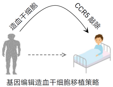 在成体造血干细胞上敲除CCR5基因,结合已经在临床上成熟应用的造血干细胞移植技术将编辑后的细胞移植给患者。造血干细胞在患者体内增殖、分化,最终可以形成能够抵御HIV病毒感染的免疫细胞。