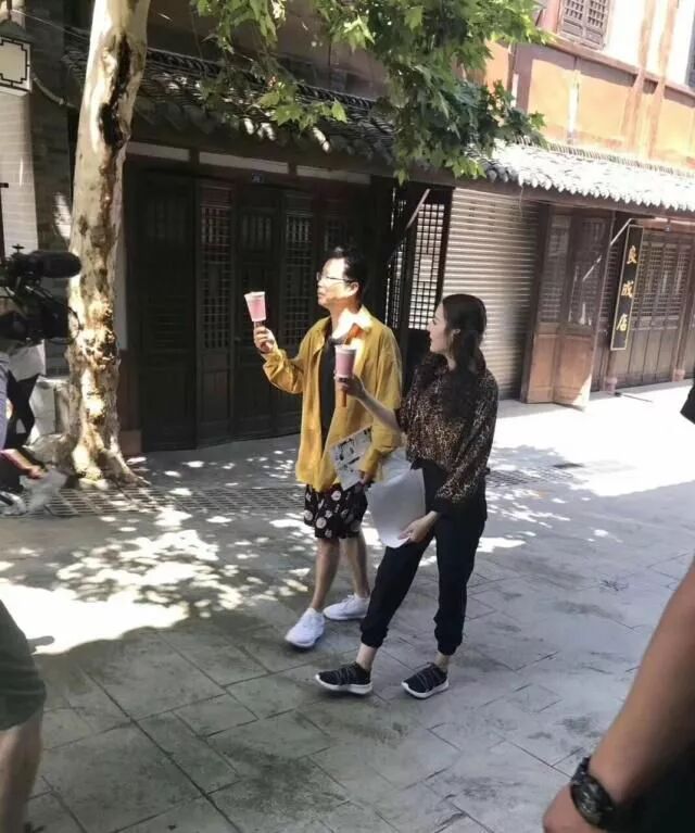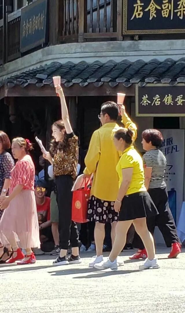 而在古镇热巴和王迅看起来很开心啊,高高举着冰淇淋,而热巴更是穿着豹纹上衣非常惹眼。