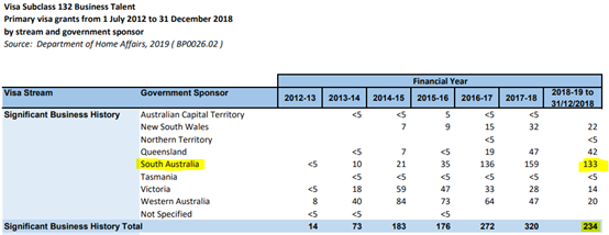 南澳获得132签证投资人“独宠”并非一朝一夕,近五年数据来看,南澳都是“喜提”132投资人最多的州(西澳次之)。根据移民局官方统计数据,从上一财年开始,也就是2018年7月1日至2018年12月31日,全澳获得132商业天才移民签证的申请一共有234列,其中选择南澳作为担保州并成功获签的有133列,已然超过了全澳132类签证下签人数的50%。