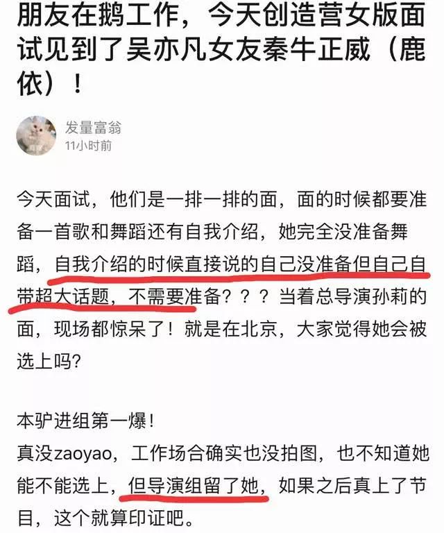 至于说到鹿依要出道一事,就是之前有娱乐博主说有人在创造营面试时碰到了鹿依,并且当时她并未准备才艺,直接就和导演说自己自带超大话题。