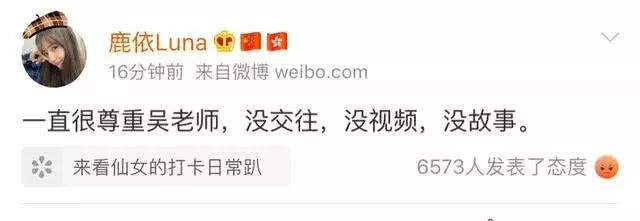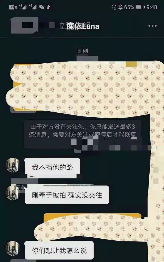 鹿依突然旧事重提,而且与之前的说法也有所不同了,之前一口否定说没交往,而今却说"刚牵手就被拍确实没交往",还说"我不挡他的路"。