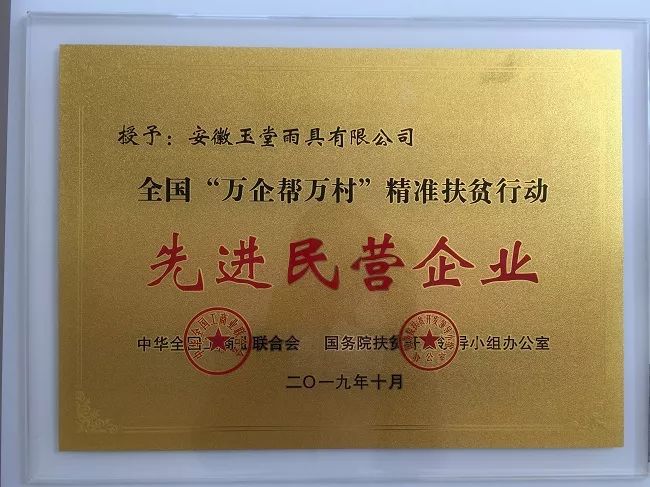 枞阳在线消息 近日,全国工商联、国务院扶贫办在京召开2019年全国“万企帮万村”精准扶贫行动先进民营企业表彰大会,授予99家民营企业全国“万企帮万村”精准扶贫行动先进民营企业荣誉称号。安徽玉堂雨具有限公司是全市唯一获奖企业,该公司总经理疏林参加大会并接受表彰。