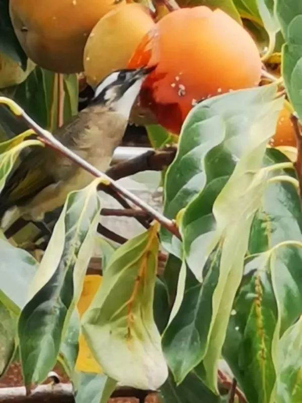 一只可爱的小鸟,东张西望后,小心翼翼地站立在枝头上,面对诱惑的“美食”——柿子,独自品尝美味,不一会儿,一只柿子被小鸟偷吃剩下二分之一。(@醉笔清风)