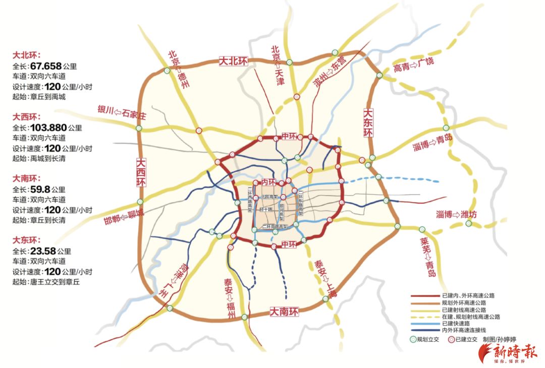 “三环十二射”高快一体路网的交通规划一经提出,便牵动起济南市民的心。如今又有了新动向!25日,济南市城乡交通运输局对“大北环”、“大南环”工程社会稳定风险分析进行首次公示,同时也公示了线路走向。大北环:从章丘到禹城,将设黄河大桥 济南绕城高速公路二环线北环段又称“大北环”。该项目全长67.658公里,采用双向六车道高速公路技术标准建设,设计速度120公里/小时,路基宽度34.5米,建设工期48个月。 此次公示介绍,“大北环”工程起自章丘区黄河镇以北,设置枢纽立交(预留远期继续南延接规划的章丘东外环高速)与规划的济南至高青高速联网,在王家圈村东侧设置黄河大桥跨越黄河,经三官庙村南后与G2516东吕高速交叉,在于良民村北跨越邢家渡干渠后与京沪高速交叉,在窦庄村北侧下穿石济客运专线及京沪高速铁路,终点在禹城市梁家镇北的京台高速,南距禹城互通约6.5公里,北距平原南立交12.3公里,通过设置枢纽立交与京台高速联网,向西南顺接二环线西环段。
