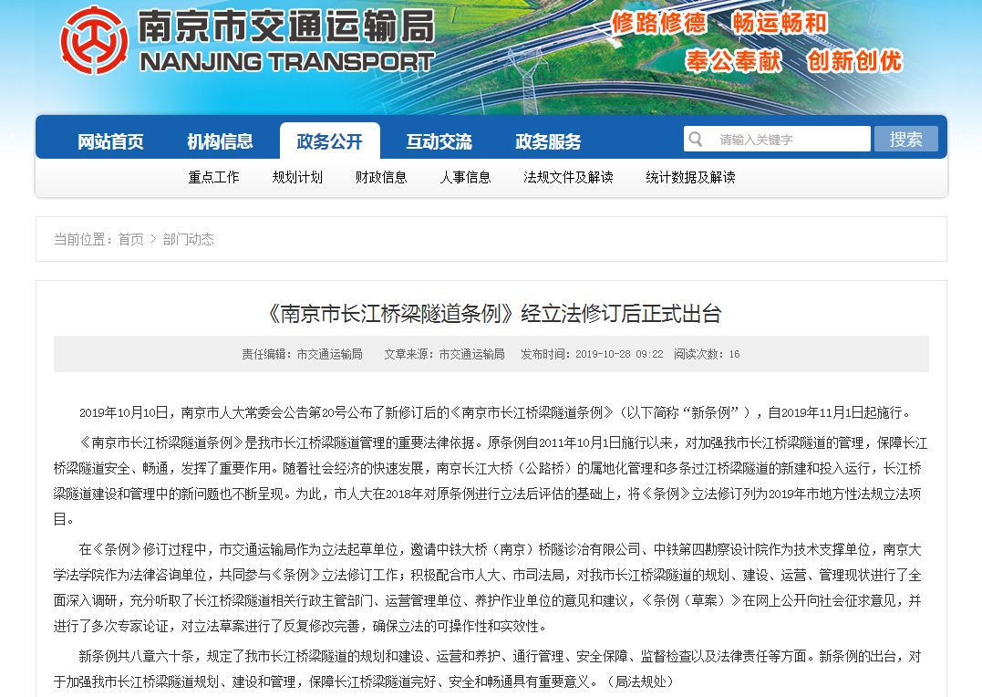 从市交通运输局获悉,2019年10月10日,南京市人大常委会公告第20号公布了新修订后的《南京市长江桥梁隧道条例》(以下简称“新条例”),自2019年11月1日起施行。